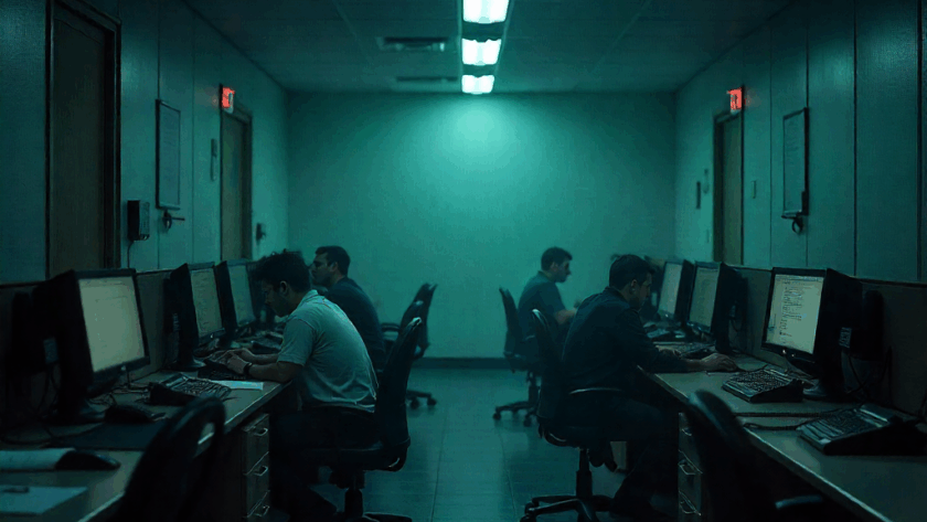 un call center; ninguno hablaba entre ellos; en los puestos de trabajo únicamente
